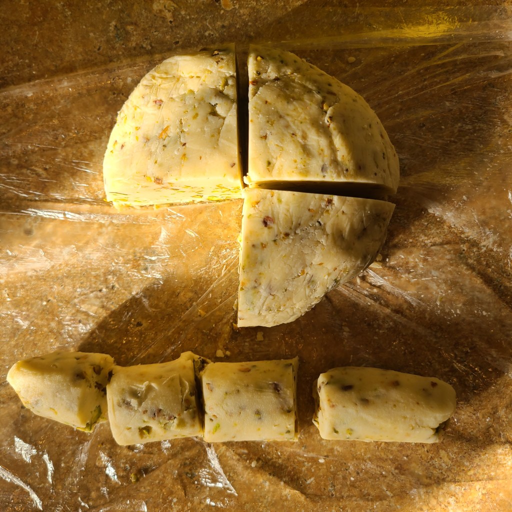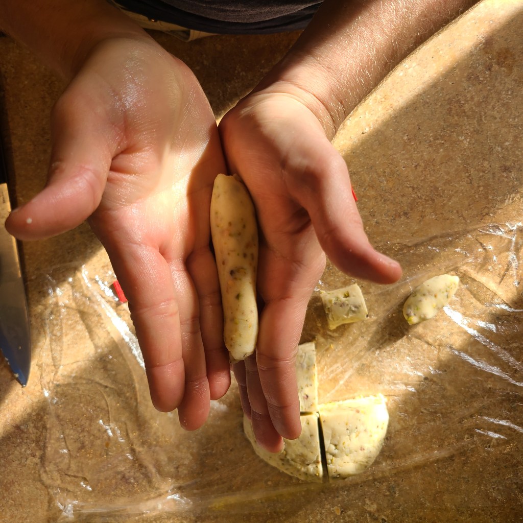- Shape into a curved “S” shape and place on a parchment lined baking sheet an inch apart. Place a whole pistachio in the middle.